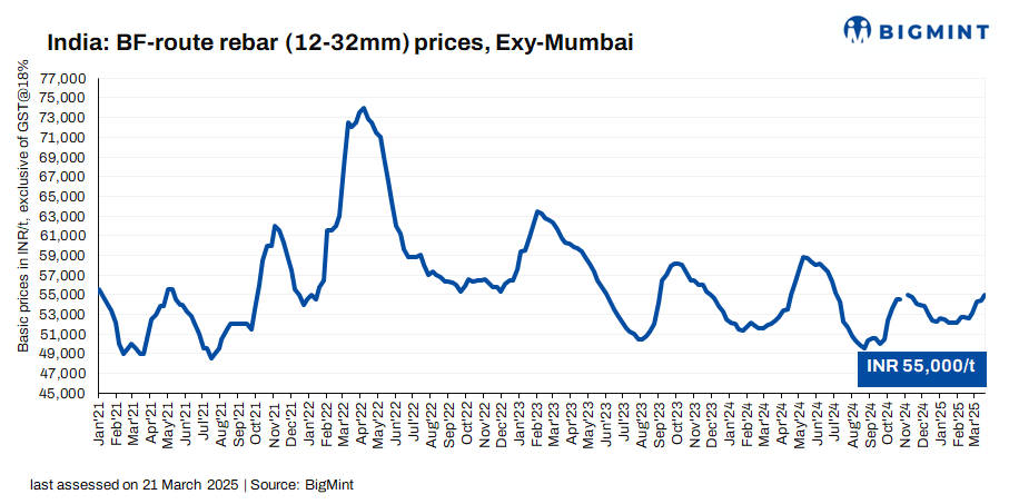 Trade-level BF rebar prices increased by INR 600/t ($7/t) w-o-w to INR 55,000/t ($638/t) exy in Mumbai, as per BigMint’s assessment on 21 March 2025. Prices are exclusive of GST at 18%.