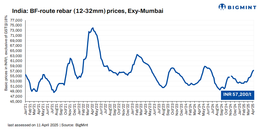 Trade-level BF rebar prices inched up by INR 200/t ($2/t) w-o-w to INR 57,200/t ($665/t) exy in Mumbai, as per BigMint’s assessment on 11 April 2025. Prices are exclusive of GST at 18%.
