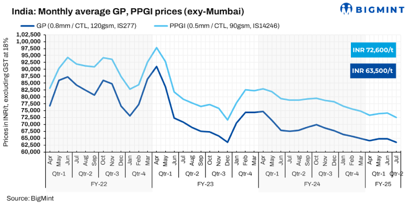 The leading private coated flat steel producers had announced their list prices for GPC (0.8mm, 80gsm) at around INR 63,500-64,000/t ($758-764/t) ex-Mumbai while PPGI (0.5mm, 90gsm) was at around INR 73,500/t ($878/t) ex-Mumbai for July 2024 sales.