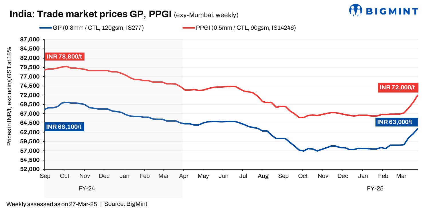 In early March 2025, mills had increased list prices by INR 1,500/t, elevating the tags for GP (0.8 mm, 80 gsm, IS277) to INR 59,000-61,500/t ex-Mumbai and PPGI (0.5 mm, 90 gsm, IS14246) to INR 68,750-69,750/t ex-Mumbai.