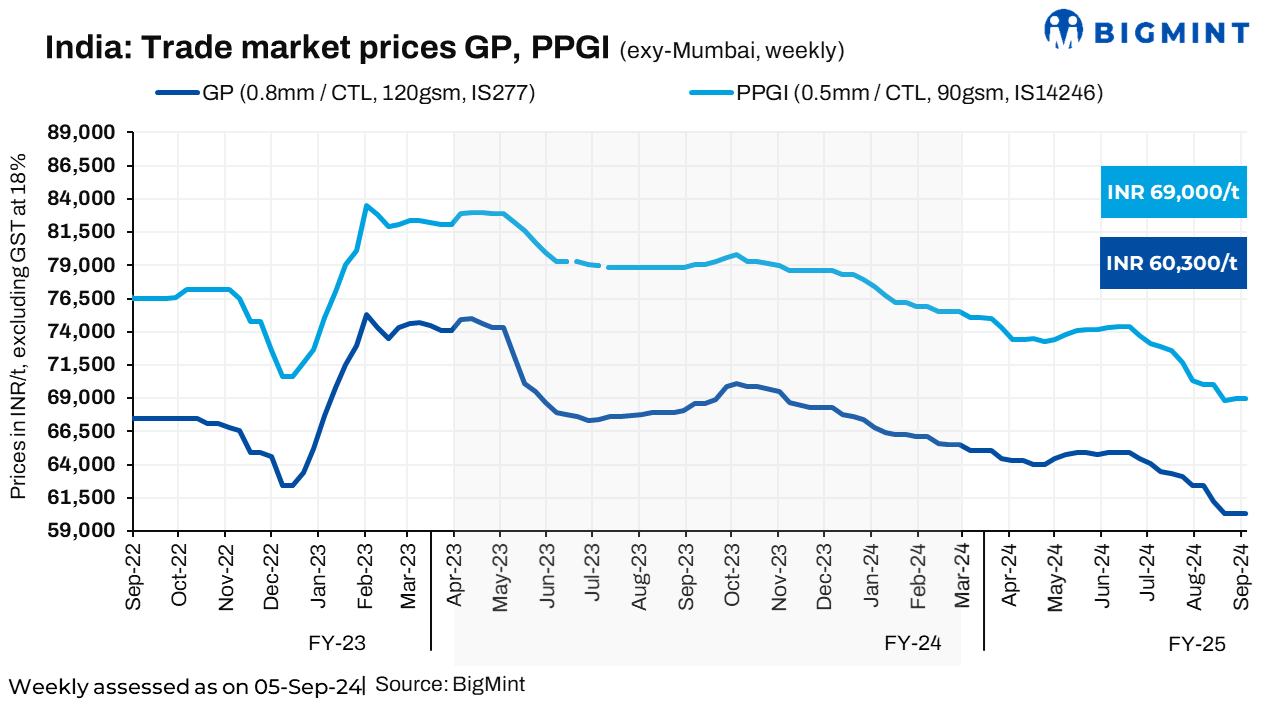 Leading private coated flat steel producers had set their list prices for galvanised plain coils (GPC) (0.8 mm, 80 gsm) at around INR 60,000-61,000/t ex-Mumbai while that of pre-painted galvanised iron (PPGI) (0.5 mm, 90 gsm) at around INR 70,000-71,500/t ex-Mumbai for September 2024 sales.