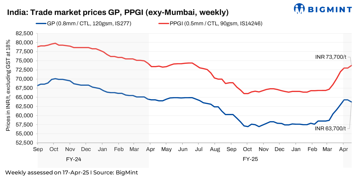 The latest weekly assessment, on 17 March 2025, shows galvanised plain (GP, 0.8 mm/CTL, 120 gsm, IS277) steel coil prices at INR 63,700/t ($/t) exy-Mumbai, with offers varying in the range of INR 63,000-64,500/t ($/t), lower by INR 100/t ($1/t) w-o-w. Similarly, pre-painted galvanised iron (PPGI, 0.5 mm/CTL, 90 gsm, IS14246) was assessed at INR 73,700/t ($/t) exy-Mumbai, with offers at INR 72,500-74,000/t ($/t). Prices are minus GST at 18% (USD 1 = INR 85.3896; INR 1 = USD 0.011711).
