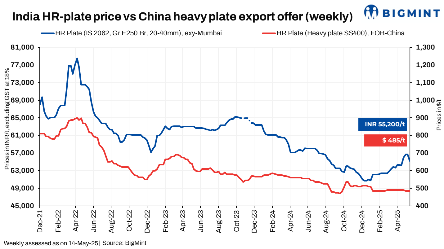 Trade-level prices of hot-rolled (HR) plates (IS2062, grade E250 Br, 20-40 mm) in India decreased by INR 1,500/t w-o-w to INR 54,500-57,000/t ex-Mumbai, as per BigMint’s weekly assessment on 15 May 2025. However, prices of hot strip mill (HSM) plates (IS2062, grade E250 Br, 5-10 mm) increased by INR 300/t w-o-w to INR 52,500-53,500/t ex-Mumbai. Prices are exclusive of 18% GST.