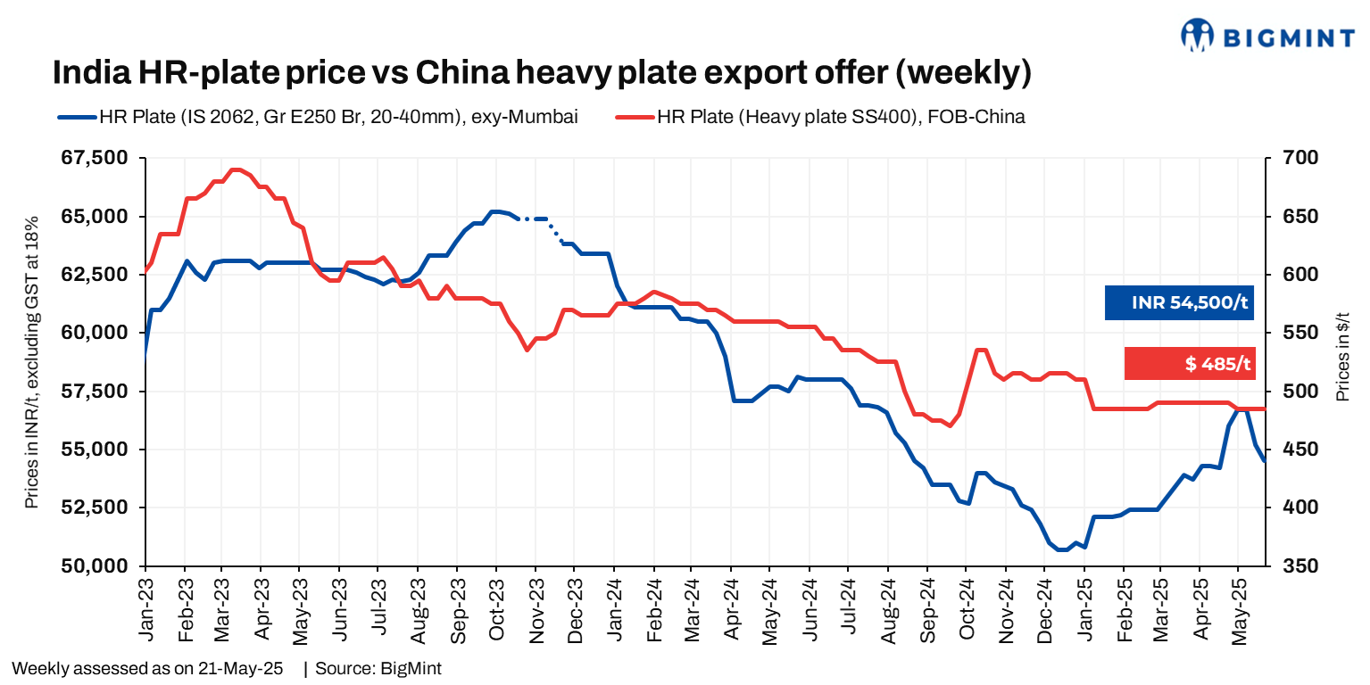 Trade-level prices of hot-rolled (HR) plates (IS2062, grade E250 Br, 20-40 mm) in India decreased by INR 700/t w-o-w to INR 53,500-56,000/t ex-Mumbai, as per BigMint’s weekly assessment on 21 May 2025. Additionally, prices of hot strip mill (HSM) plates (IS2062, grade E250 Br, 5-10 mm) fell by INR 500/t w-o-w to INR 52,000-53,000/t ex-Mumbai. Prices are exclusive of 18% GST.