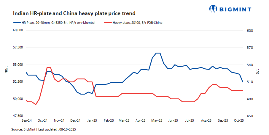 India’s trade-level hot-rolled (HR) plate (IS2062, Gr E250 Br, 20-40 mm) prices stood at INR 52,000-53,000//tonne (t), exy-Mumbai, dropping by approximately INR 1,000/t w-o-w on 8 October 2025. This decline in prices can be attributed to low domestic demand ahead of festivities.
