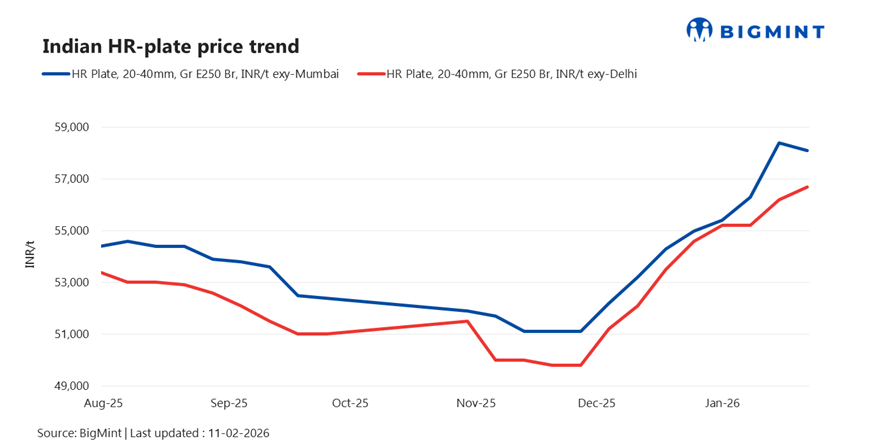 BigMint’s weekly benchmark assessment for HR plate (20–40 mm, Gr E250 Br.) inched down by INR 300/t ($3/t) w-o-w to INR 58,100/t ($642/t) as of 11 February 2026, compared with INR 58,400/t ($645/t) in the previous week. This marginal decline was attributed to slow trading activity, even as demand remained moderate. Prices are quoted ex-Mumbai for the distributor-to-dealer segment and exclude 18% GST.