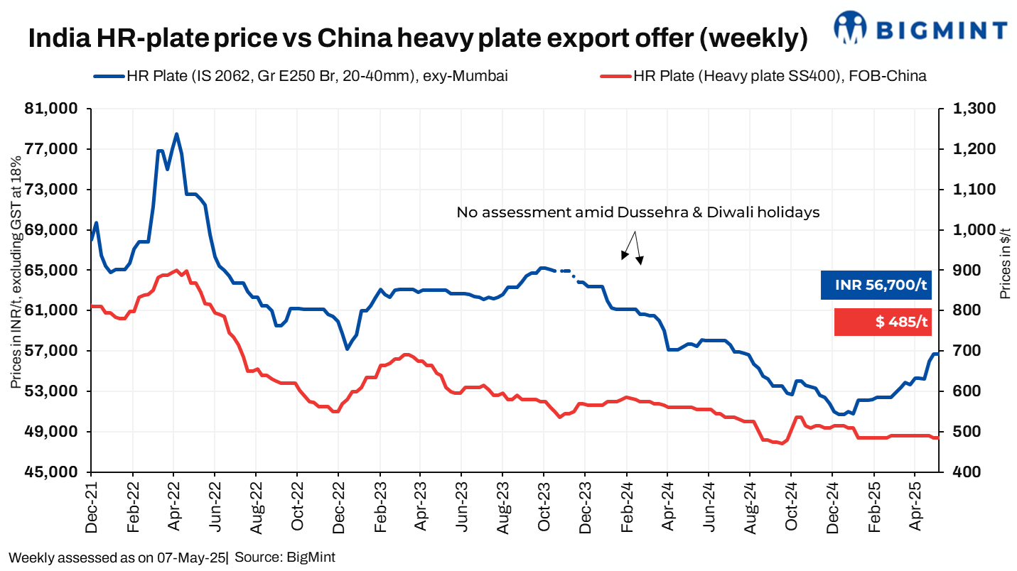 Trade-level prices of hot-rolled (HR) plates (IS2062, grade E250 Br, 20-40 mm) in India remained stable w-o-w at INR 54,500-57,000/t ex-Mumbai, as per BigMint’s weekly assessment on 7 May 2025. Similarly, prices of hot strip mill (HSM) plates (IS2062, grade E250 Br, 5-10 mm) remained stable w-o-w at INR 52,500/53,500/t ex-Mumbai. Prices are exclusive of 18% GST.