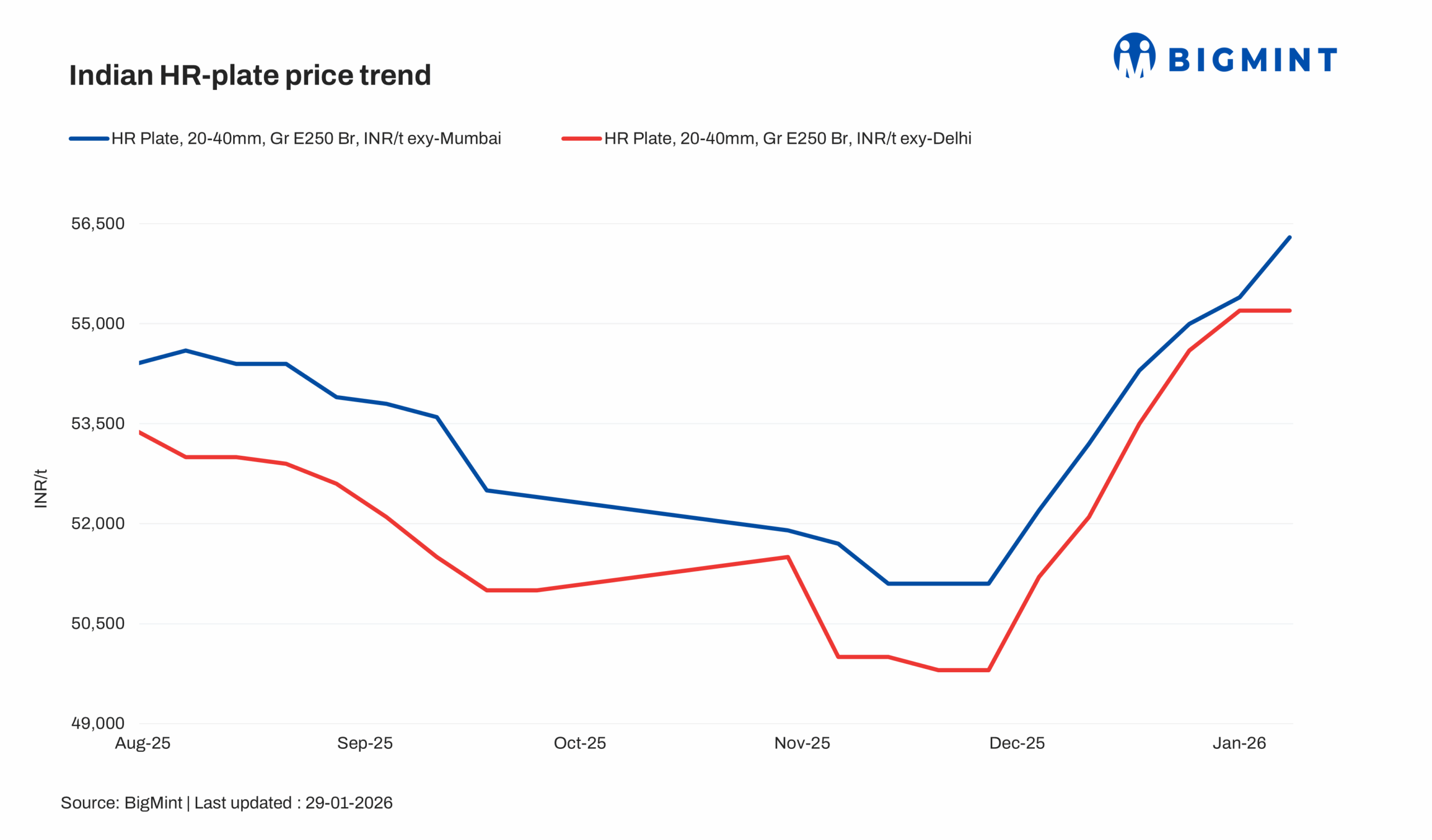 India’s trade-level HR plate (20-40 mm, Gr E250 Br.) prices rose by INR 900/t ($10/t) w-o-w to INR 56,300/t ($612/t) ex-Mumbai, excluding 18% GST, on 29 Jan’26 from INR 55,400/t ($602/t) a week ago. Supply constraints and steady demand led to positive sentiment, driving the price rise. Moreover, a market participant said that list price hikes may take place next month, further reinforcing the optimistic outlook.