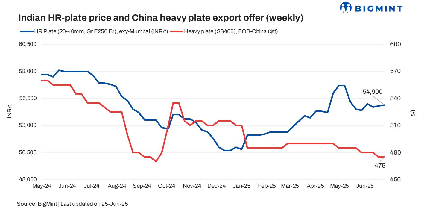 India’s hot-rolled (HR) plate (IS2062, Gr E250 Br, 20-40 mm) prices remained range-bound w-o-w at INR 53,500-56,000/tonne (t) exy-Mumbai on 19 June 2025, amid sluggish demand. Additionally, prices of hot strip mill (HSM) plates (IS2062, Gr E250 Br, 5-10 mm) remained stable w-o-w at INR 51,500-52,500/t exy-Mumbai. Prices exclude 18% GST.