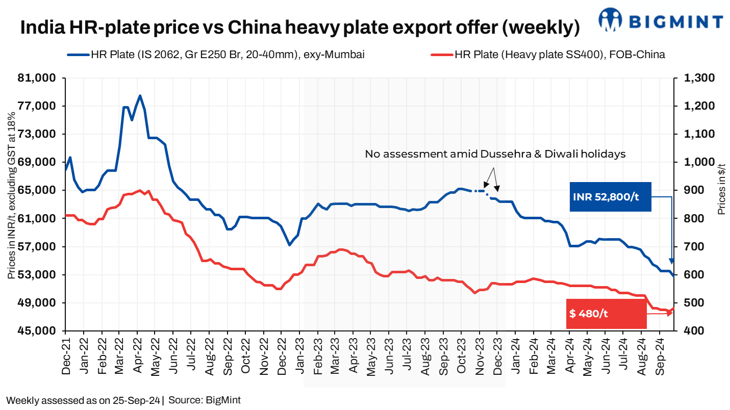 BigMint’s weekly assessment for HR plates (IS2062, Gr E250 Br, 20-40mm) was around INR 48,500-49,500/t exy-Mumbai as of 27 September 2024, down by INR 700/t w-o-w. Meanwhile, weekly prices of hot strip mill (HSM) plates (IS2062, Gr E250 Br, 5-10mm) remained range-bound at INR 50,000-51,000/t exy-Mumbai, influenced by the decline in hot rolled coil (HRC) prices. Prices mentioned above exclude GST at 18%.