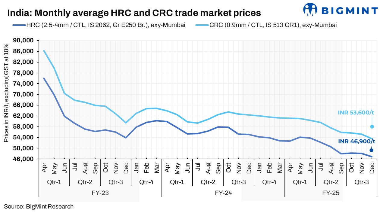 India: Trade-level HRC, CRC monthly average prices fall by up to INR 1,600/t in Dec’24