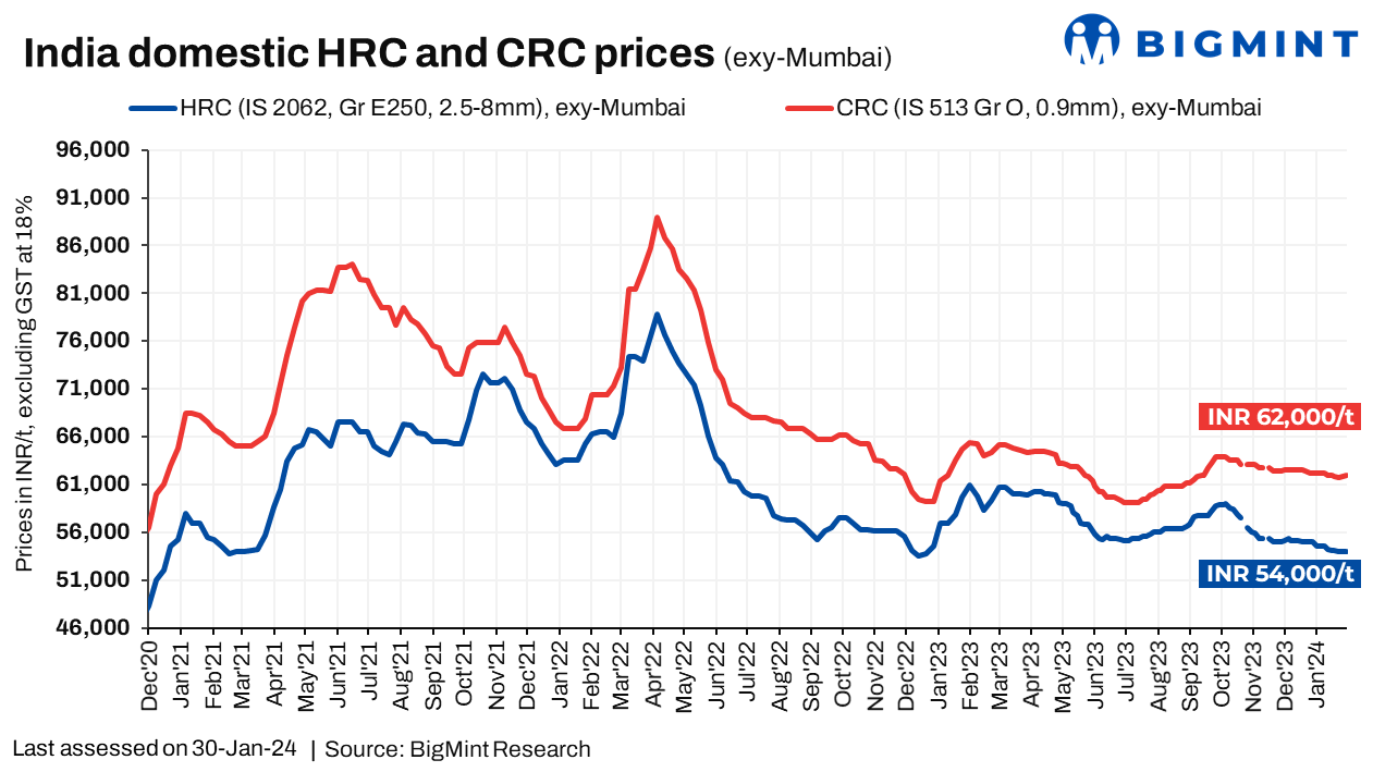 As of January 30, 2024, BigMint’s bi-weekly benchmark evaluation for Hot Rolled Coils (HRC) (IS2062, Grade E250, 2.5-8mm), stood steady at INR 54,000/t ($664/t), maintaining consistency with the preceding week’s rates. Meanwhile, Cold Rolled Coils (CRC) (IS513, Grade O, 0.9mm), witnessed a price upturn of INR 300/t, reaching INR 62,000/t ($755 per ton) during the same period. (INR 1 = USD 0.012015 ; USD 1 = INR 83.229)