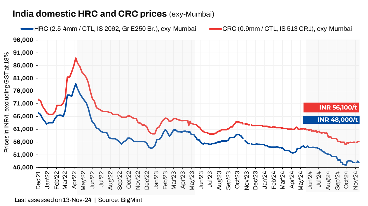 BigMint’s benchmark assessment (bi-weekly) for HRCs (IS2062, Gr E250, 2.5-8 mm) fell by INR 500/t ($6/t) to INR 48,000/t ($569/t) on 13 November 2024. However, CRCs (IS513, Gr O, 0.9 mm) remained stable at INR 56,100/t ($665/t). These prices are quoted ex-Mumbai, excluding 18% GST, and are for cut-to-length (CTL) deliveries.