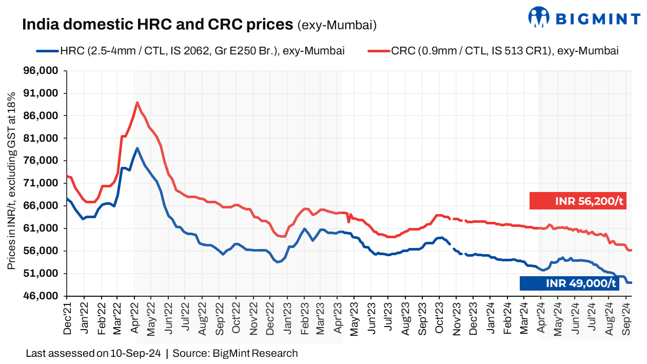 BigMint’s benchmark prices for HRC (2.5-8mm, IS2062, Gr E250 Br) and CRC (0.9mm, IS513 CR1) remained unchanged in the Mumbai market as on 10 September 2024. Prices stood at INR 49,000/t ($583/t) and INR 56,200/t ($669/t) respectively, excluding 18% GST.
