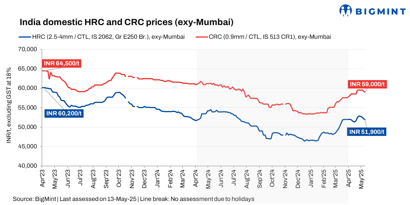 Import trends: India’s bulk imports of HRCs and plates touched 70,025 t as of 12 May, based on vessel line-up data from BigMint. The same totalled 306,260 t in April 2025 and 408,762 t in March 2025.