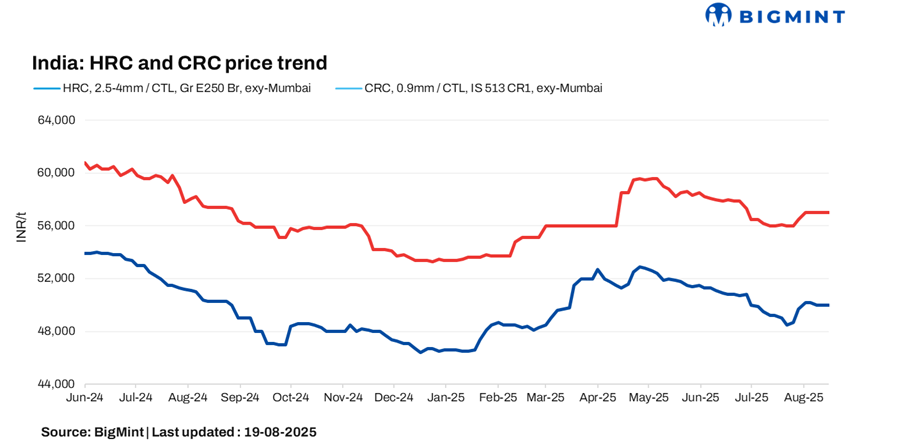 BigMint’s benchmark assessment (bi-weekly) for HRCs (IS2062, Gr E250, 2.5-8 mm/CTL) held stable w-o-w to INR 50,000/t ($574/t) on 19 August 2025. Similarly, on the other hand, CRC (IS513, Gr O, 0.9 mm/CTL) prices held stable w-o-w at INR 57,000/t ($655/t) on Tuesday. These prices are ex-Mumbai for the distributor-to-dealer segment and exclude 18% GST.