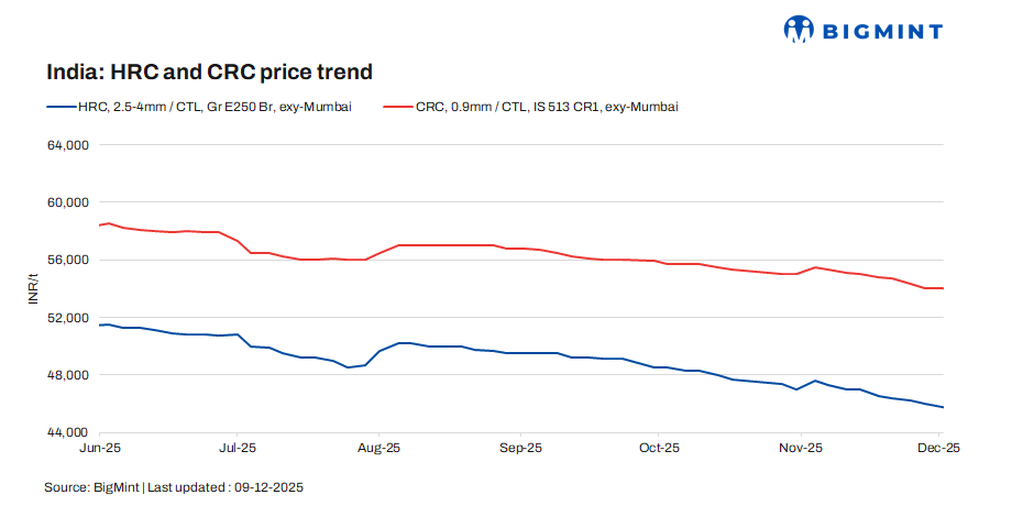 BigMint’s bi-weekly benchmark for HRCs (IS2062, Gr E250, 2.5-8 mm/CTL) saw a slight adjustment of INR 100/t ($1/t) w-o-w, settling at INR 45,700/t ($509/t) on 9 December 2025, compared to INR 45,800/t ($510/t) the previous week. CRC (IS513, Gr O, 0.9 mm/CTL) prices experienced a marginal change of INR 200/t ($2/t) w-o-w, standing at INR 53,800/t ($599/t) on 9 December versus INR 54,000/t ($601/t) the week prior. These prices are ex-Mumbai for the distributor-to-dealer segment and exclude 18% GST.