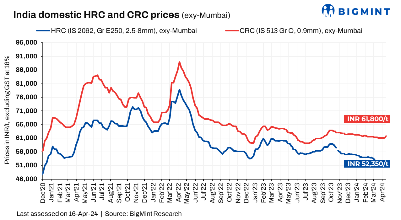 BigMint’s benchmark assessment (bi-weekly) for HRC (IS2062, Gr E250, 2.5-8mm) prices increased by INR 350/t ($4/t) to INR 52,350/t ($627/t) on 16 April 2024, compared to the previous week. Also, CRC (IS513, Gr O, 0.9mm) prices were up by INR 500/t ($6/t) to INR 61,800/t ($740/t) during the same period. These prices are quoted ex-Mumbai, excluding 18% GST, and are for cut-to-length (CTL) deliveries. (INR 1 = USD 0.0119729 ; USD 1 = INR 83.522)