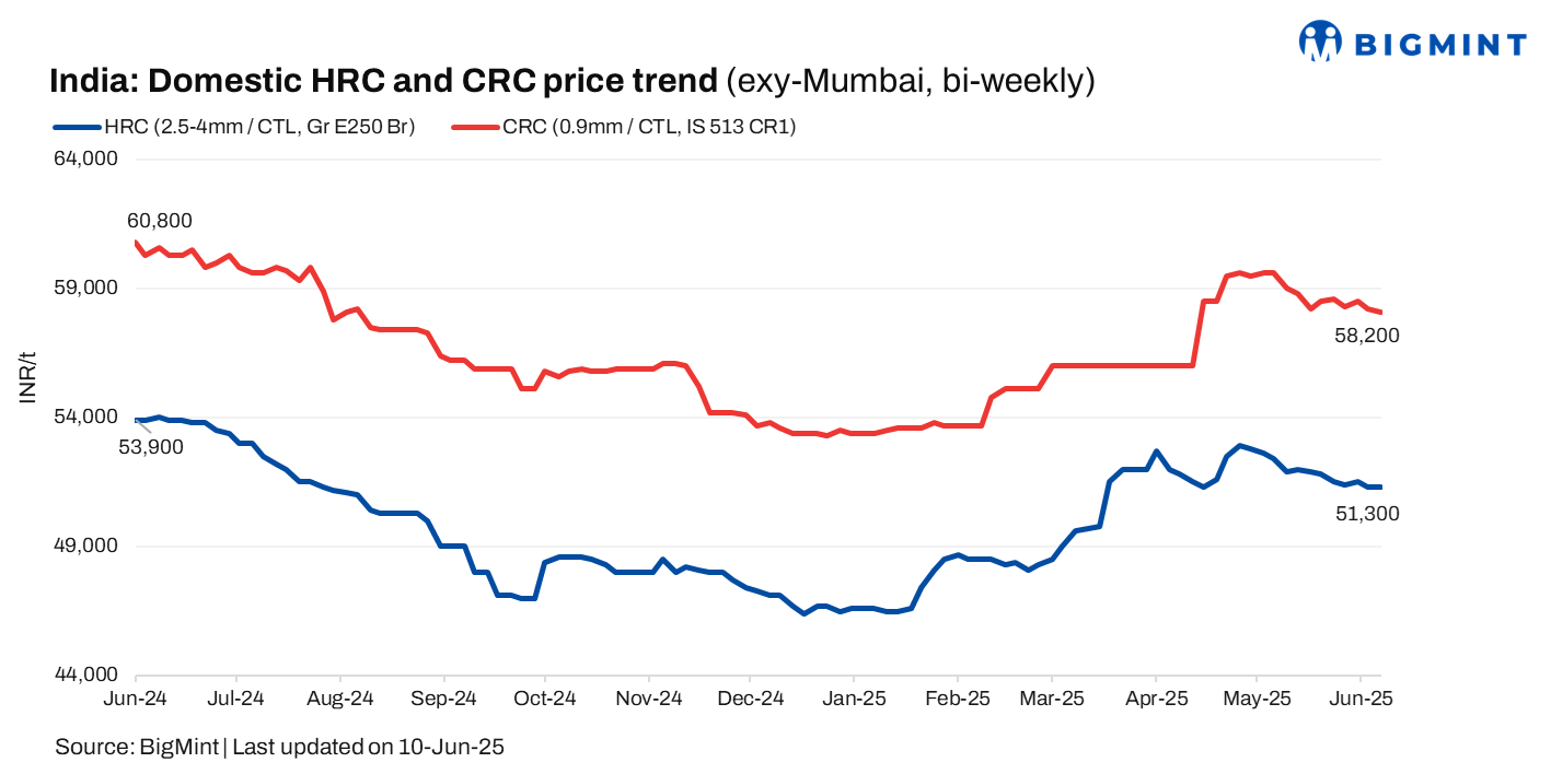 HRC prices are expected to remain rangebound in the near term amid weak demand and steady trade-level offers. CRC prices may face mild downward pressure, as cautious buying and monsoon-related disruptions weigh on sentiment despite no mill-level price support.