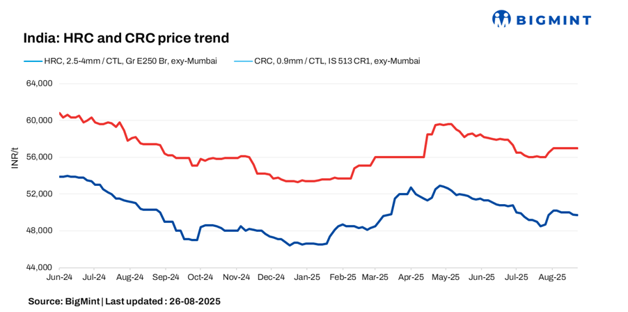 BigMint’s benchmark assessment (bi-weekly) for HRCs (IS2062, Gr E250, 2.5-8 mm/CTL) fell by INR 300/t ($3/t) w-o-w to INR 49,700/t ($567/t) on 26 August 2025 against INR 50,000/t ($570/t) on 19 August 2025. However, on the other hand, CRC (IS513, Gr O, 0.9 mm/CTL) prices held stable w-o-w at INR 57,000/t ($650/t) on Tuesday. These prices are ex-Mumbai for the distributor-to-dealer segment and exclude 18% GST.