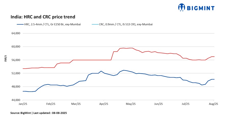 BigMint’s benchmark assessment (bi-weekly) for HRCs (IS2062, Gr E250, 2.5-8 mm/CTL) held stable w-o-w to INR 50,200/t ($573/t) on 8 August 2025. Similarly, on the other hand, CRC (IS513, Gr O, 0.9 mm/CTL) prices held stable w-o-w at INR 57,000/t ($651/t) on Friday. These prices are ex-Mumbai for the distributor-to-dealer segment and exclude 18% GST.