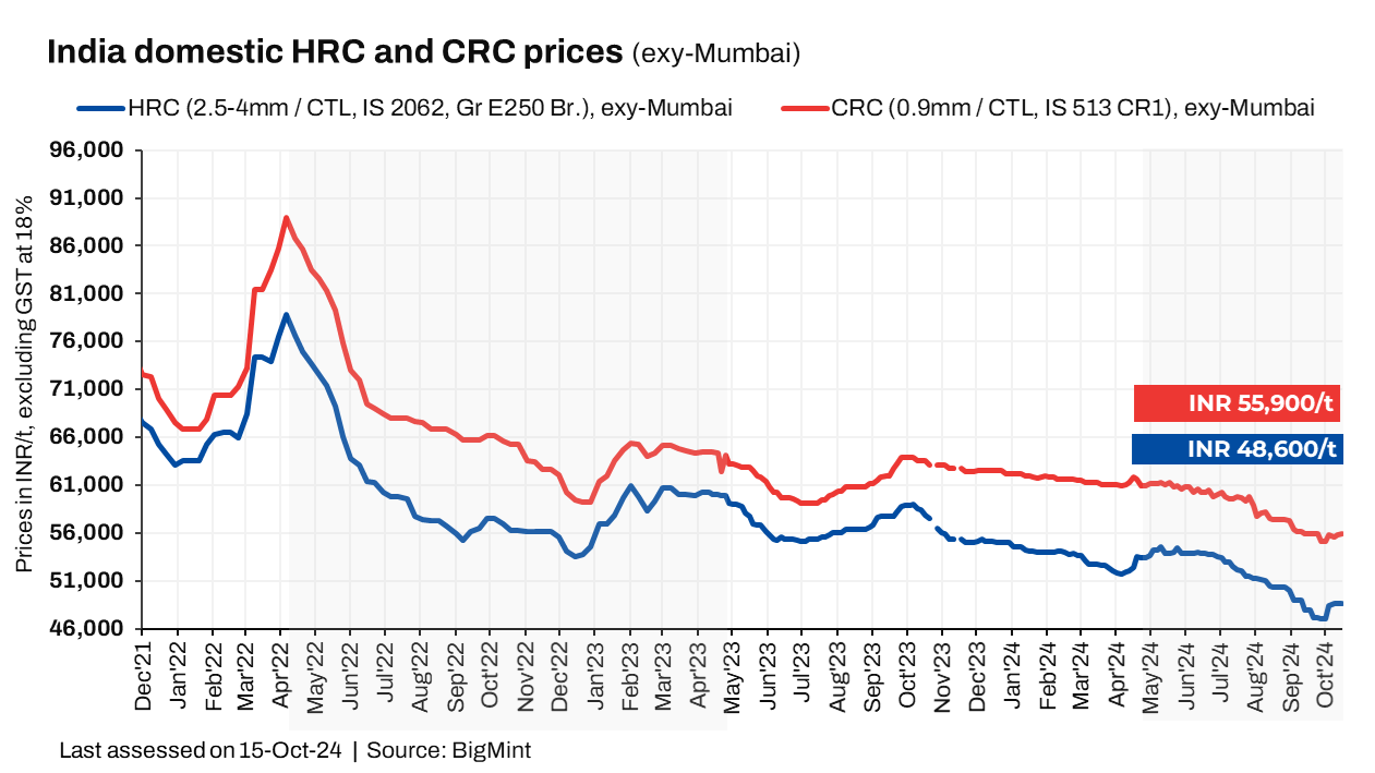 BigMint’s benchmark assessment (bi-weekly) for HRCs (IS2062, Gr E250, 2.5-8mm) remained stable at INR 48,600/t on 15 October 2024. However, CRC (IS513, Gr O, 0.9mm) prices increase marginally by INR 100/t to INR 55,900/t. These prices are quoted ex-Mumbai, excluding 18% GST, and are for cut-to-length (CTL) deliveries.