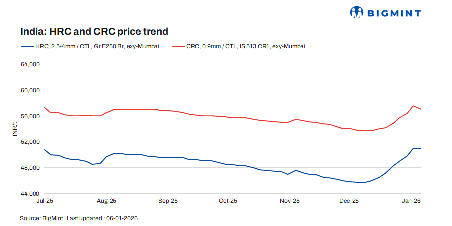 Similarly, on the other hand, CRC (IS513, Gr O, 0.9 mm/CTL) prices increased by INR 600/t ($7/t) w-o-w to INR 57,000/t ($632/t) on 6 January 2026 against INR 56,400/t ($525/t), the last week. These prices are ex-Mumbai for the distributor-to-dealer segment and exclude 18% GST.