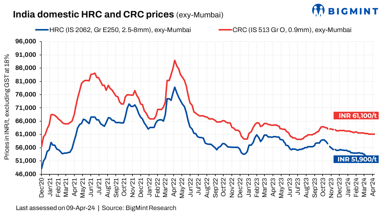 BigMint’s benchmark assessment (bi-weekly) for HRC (IS2062, Gr E250, 2.5-8mm) inched up by INR 200/t ($2/t) to INR 51,900/t ($624/t) on 9 April 2024, compared to the previous week. Also, CRC (IS513, Gr O, 0.9mm) prices were up by INR 200/t ($2/t) at INR 61,100/t ($734/t) during the same period. These prices are ex-Mumbai, excluding 18% GST, and are for cut-to-length (CTL) deliveries. (INR 1 = USD 0.0120154 ; USD 1 = INR 83.2265)