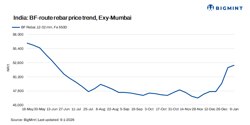 2. Raw materials prices edge up w-o-w: Prices of major raw materials increased w-o-w, supporting BF rebar prices. BigMint’s Odisha iron ore fines (Fe 62%) index edged up by INR 50/t ($0.55/t) w-o-w to INR 5,800/t ($64/t) ex-mines. Iron ore prices in the Odisha market remained firm last week, as assessed on 3 January, supported by active trading activity and a sharp improvement in downstream steel prices. Market participants noted that trades are now getting concluded at higher levels, while material availability remains limited.