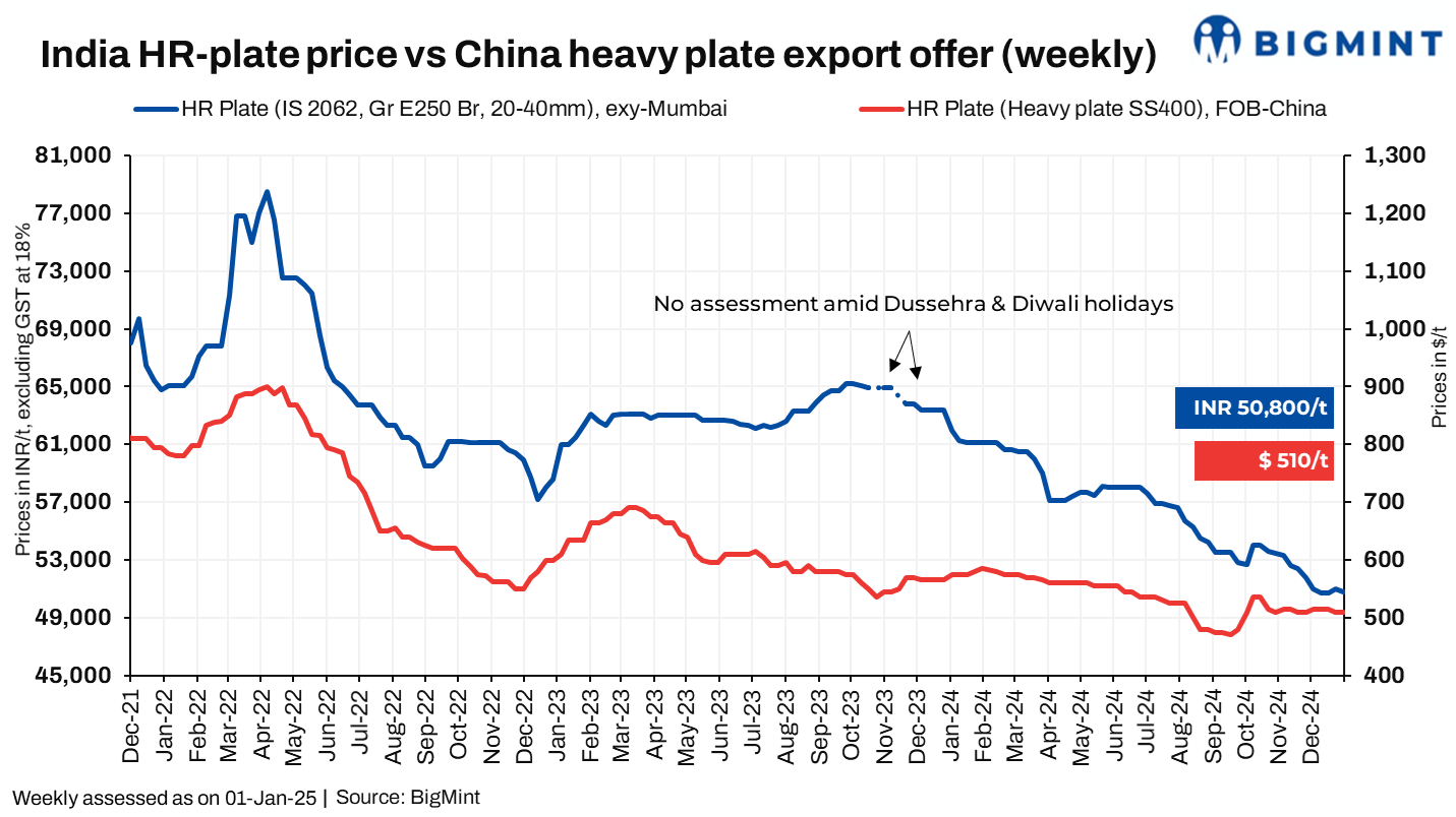 Trade-level prices of hot-rolled plate-mill (PM) plates (IS2062, Gr E250 Br, 20-40 mm) remained rangebound w-o-w. BigMint’s weekly assessment of HR plate (IS2062, Gr E250 Br, 20-40 mm) fell by INR 200/t in the range of INR 49,000-52,500/t exy-Mumbai on 1 January, 2025. Additionally, prices of hot strip mill (HSM) plates (IS2062, Gr E250 Br, 5-10 mm) were rangebound at INR 47,500-49,000/t ($560-578/t) exy-Mumbai. Prices exclude 18% GST.