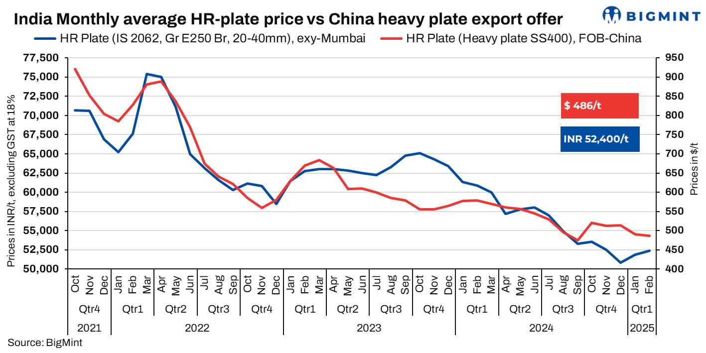 Monthly average prices of hot-rolled (HR) plates (IS2062, Gr E250 Br, 20-40 mm) increased by INR 500/t to INR 52,400/t in February 2025 from INR 51,900/t in January 2025.