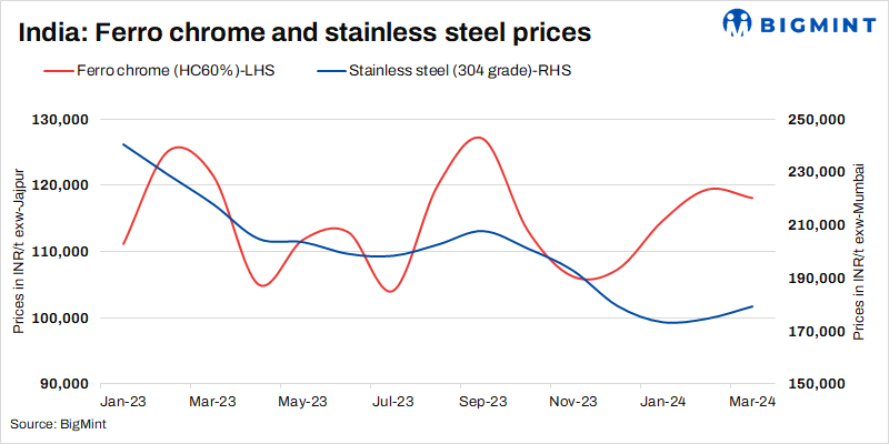 China’s market, its impact on Indian market: Prices of ferro chrome (HC60%) rose by RMB 300/t ($42/t) w-o-w China, reaching RMB 9,150/t ($1,271/t) exw-Inner Mongolia. Additionally, Tsingshan’s ferro chrome tender prices increased by RMB 500/t ($69/t) m-o-m to RMB 8,995/t ($1,249/t) DAP. As a result, Indian export prices have gone up, but there still remains a gap between domestic and Chinese prices.