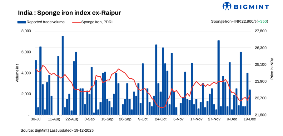 Sponge iron prices across major Indian markets recorded an increase of INR 100-350/t on 19 December 2025, supported by improved market sentiment following anti-dumping developments and firmer offers from leading producers. The sharpest rise of around INR 350/t was observed in Raipur, driven by marginally better buying interest and a more optimistic short-term market outlook.