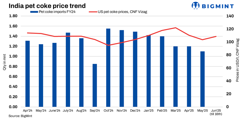 US-origin pet coke prices in India edged up by $1/t w-o-w to $107-109/t CFR at both eastern and western ports. However, demand was weak, as cement sector consumption has slowed amid the onset of the monsoon. Saudi-origin offers were stable at $109-111/t CFR, supported by limited supply and higher freights. Overall market sentiment remained subdued despite the marginal price rise.