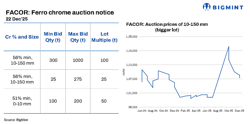 Vedanta-Ferro Alloys Corporation (FACOR) will conduct an auction for high-carbon ferro chrome (Cr: 56% min, 0-150 mm) on 22 Dec’25. The minimum permissible bid quantity across lots is 25-300 t. BigMint assessed HC ferro chrome (Cr: 60%, 10-150 mm) prices at INR 107,400/t ex-Jajpur on 19 Dec’25.