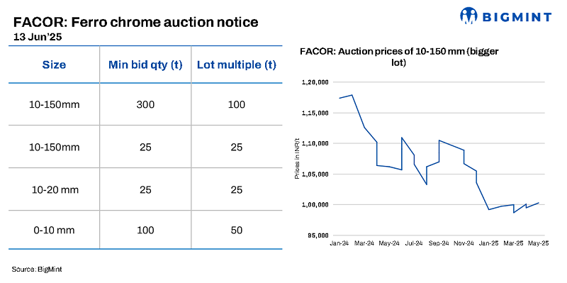 Vedanta-Ferro Alloys Corporation (FACOR) has scheduled an auction for high-carbon ferro chrome (0-150 mm) on 13 Jun’25. The minimum allowed bid quantity for all lots is 25-300 t. In the previous auction on 21 May, the larger lot of 10-150 mm fetched an H1 price of INR 100,300/t exw. BigMint assessed ferro chrome (HC 60%, Si: 4%) prices at INR 100,800/t exw-Jajpur on 11 Jun’25.