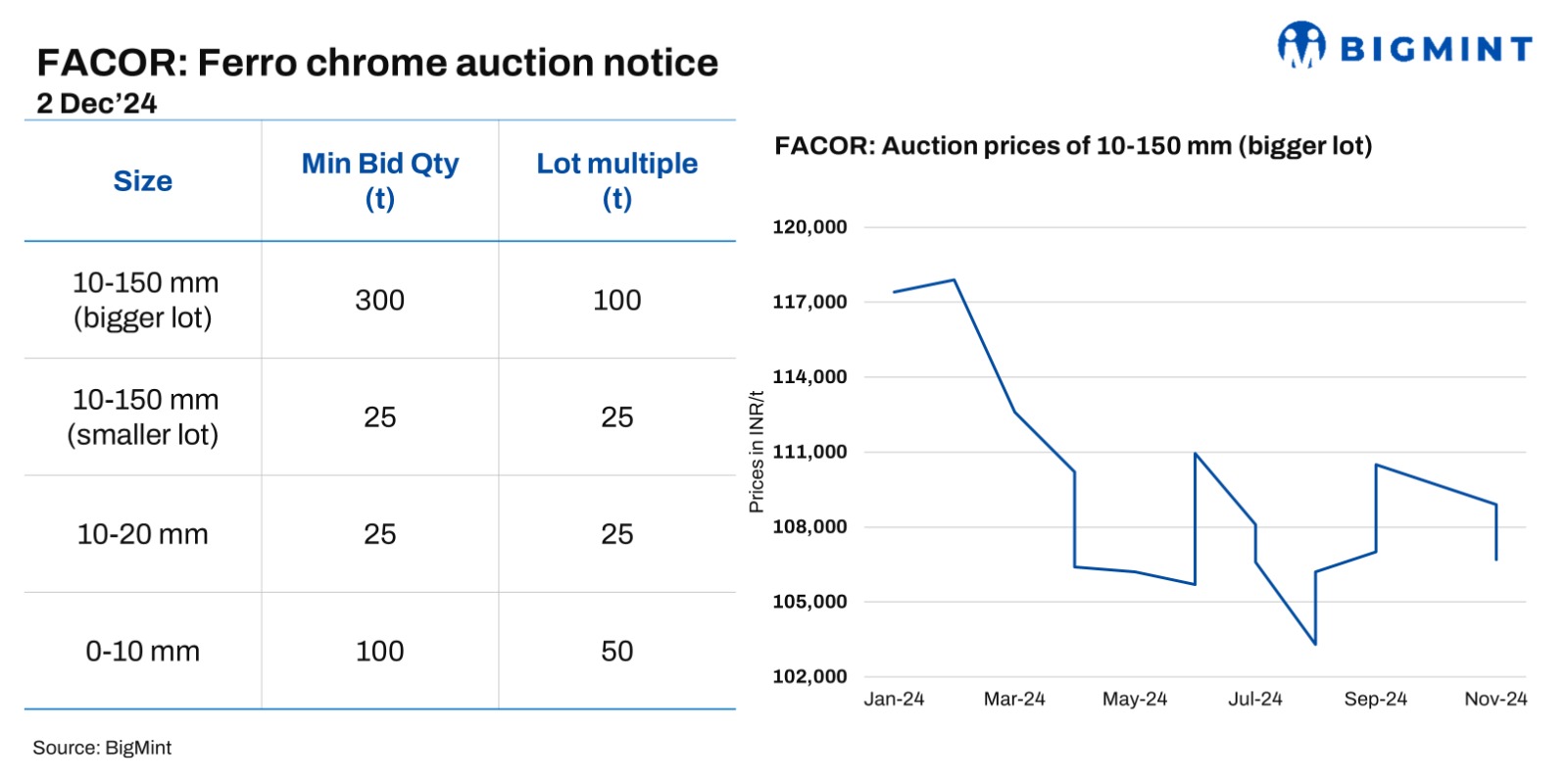 Vedanta-Ferro Alloys Corporation (FACOR) has scheduled an auction for high-carbon (HC) ferro chrome (0-150 mm) on 2 Dec’24. At the previous auction on 22 Nov’24, the larger lot of 10-150 mm achieved an H1 price of INR 106,700/t exw. BigMint assessed ferro chrome (HC60%, 10-150 mm) prices at INR 107,400/t exw-Jajpur on 29 Nov’24.
