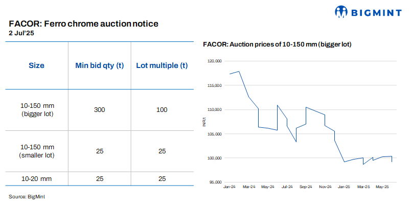 Vedanta-Ferro Alloys Corporation Ltd (FACOR) has scheduled an auction for high-carbon (HC) ferro chrome (10-150 mm) on 2 Jul’25. At the previous auction on 23 Jun’25, the bigger lot of 10-150 mm fetched an H1 price of INR 99,200/t ($1,157/t) exw. BigMint assessed ferro chrome (HC 60%, 10-150 mm) prices at INR 100,000/t ($1,166/t) exw-Jajpur on 27 Jun’25.