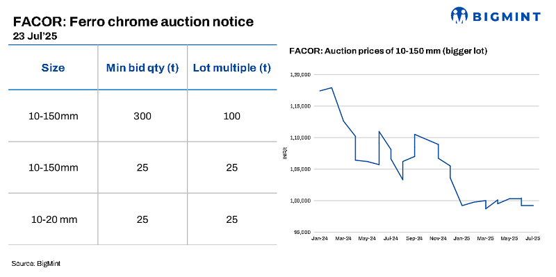 Vedanta-Ferro Alloys Corporation (FACOR) will conduct an auction for high-carbon ferro chrome (10-150 mm) on 23 Jul’25. The minimum allowed bid quantity for all lots is 25-300 t. At the previous auction on 2 Jul, the larger lot of 10-150 mm fetched an H1 price of INR 99,200/t ($1,150/t) exw. BigMint assessed ferro chrome (HC 60%, Si: 4%,10-150 mm) prices at INR 99,600/t ($1,156/t) exw-Jajpur on 18 July.
