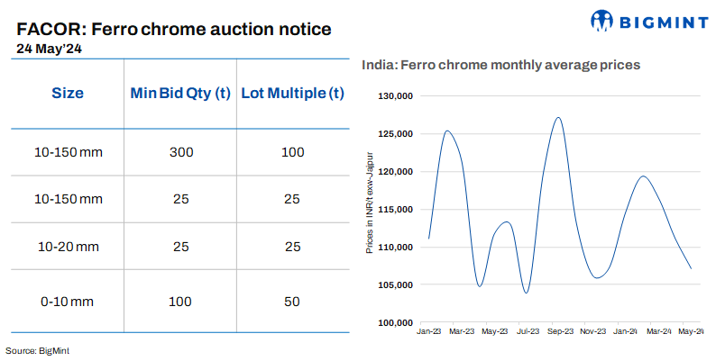 Vedanta-Ferro Alloys Corporation Ltd (FACOR) will auction high-carbon (HC) ferro chrome (0-150 mm) on 24 May’24. At the previous auction on 8 May, the larger lot (10-150 mm) received an H1 price of INR 106,200/t exw. BigMint reported ferro chrome (HC60%, 10-150 mm) prices at INR 106,500/t exw Jajpur on 22 May.