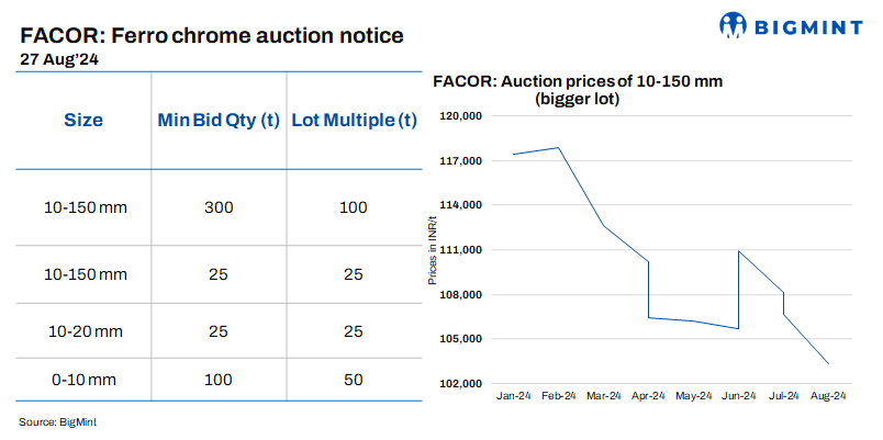 Vedanta-FACOR will auction high-carbon (HC) ferro chrome (0-150 mm) on 27 Aug’24. In the last auction on 7 Aug’24, the 10-150 mm lot reached INR 103,300/t exw. The market remains volatile after OMC’s chrome ore auction. FACOR’s upcoming auction will offer a clearer price outlook.