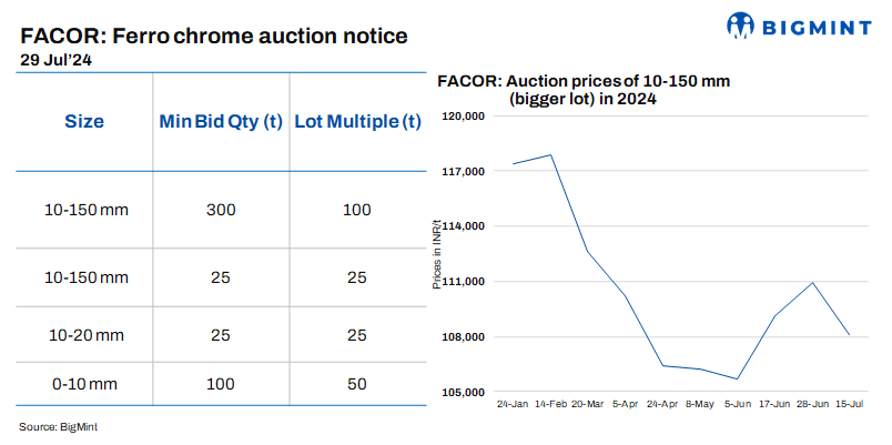 Vedanta-Ferro Alloys Corporation Ltd (FACOR) has scheduled an auction for high-carbon (HC) ferro chrome (0-150 mm) on 29 Jul’24. At the previous auction on 15 Jul’24, the bigger lot of 10-150 mm fetched an H1 price of INR 108,100/t exw. BigMint assessed ferro chrome (HC60%) prices at INR 107,200/t exw-Jajpur on 26 Jul’24.