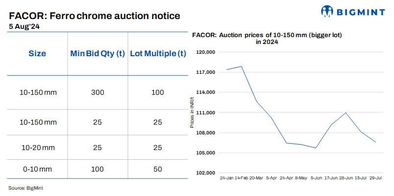 Vedanta-Ferro Alloys Corporation Ltd (FACOR) has scheduled an auction for high-carbon (HC) ferro chrome (0-150 mm) on 5 Aug’24. At the previous auction on 29 Jul’24, the bigger lot of 10-150 mm achieved an H1 price of INR 106,600/t exw. BigMint assessed ferro chrome (HC60%) prices at INR 106,200/t exw-Jajpur on 31 Jul’24.