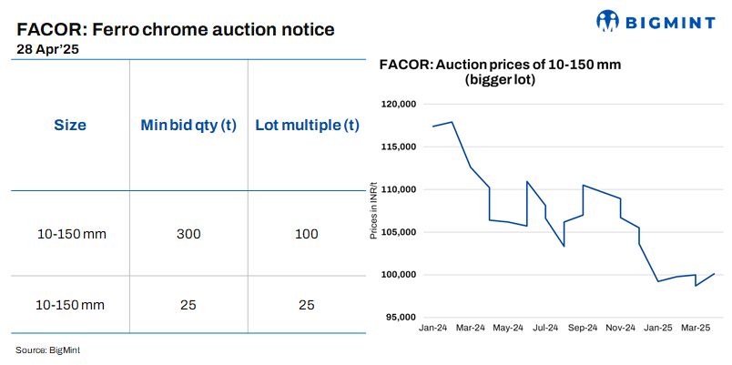 The ferro chrome (10-150 mm) auction from Vedanta-Ferro Alloys Corporation (FACOR), which was scheduled for 23 Apr’25, has been shifted to 28 Apr’25. The minimum allowed bid quantity for both lots is 25-300 t. At the previous auction on 14 Apr’25, the larger lot of 10-150 mm fetched an H1 price of INR 100,100/t exw.