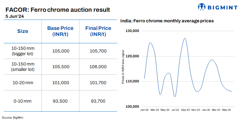 In yesterday’s Vedanta-FACOR auction, the larger lot (10-150 mm) fetched INR 105,700/t exw against a base price of INR 105,000/t, while the smaller lot fetched INR 106,000/t exw, INR 500/t up from base price. Both prices dropped by INR 500-900/t since the last auction on 8 May, indicating continued low interest in higher ferro chrome prices.