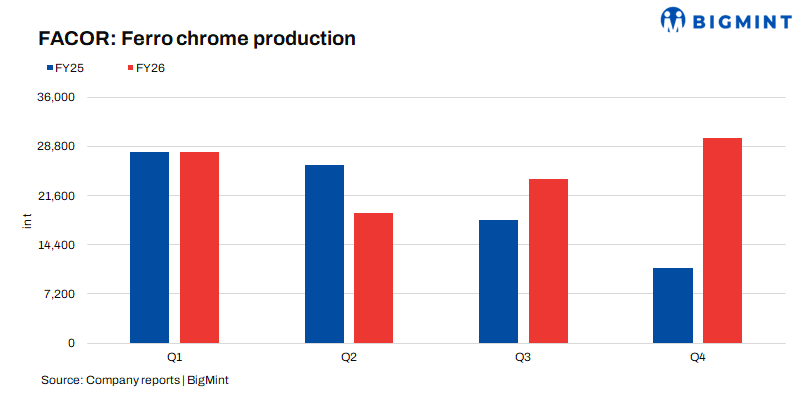 Vedanta-FACOR’s ferro chrome production increased 21% y-o-y to 101,000 t in FY’26 from 83,000 t in FY’25. Meanwhile, chrome ore output rose 49% y-o-y to 371,000 t from 250,000 t. The increase was driven by higher mining output, improved availability of high-grade ore, and the restart of Kalarangiata mines along with enhanced EC capacity at the Ostapal mine.