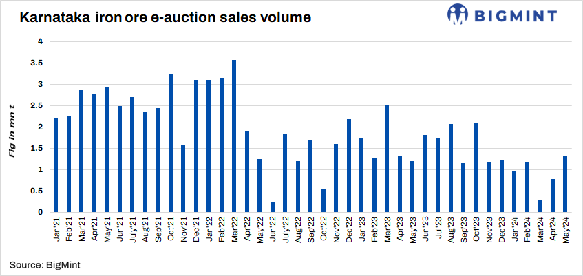 Vedanta Limited has scheduled an auction for 40,000 t of iron ore siliceous lumps (low alumina, high silica, 6-20/10-40 mm, Fe 50.5-52.5%) from its A.Narrain Mines, Karnataka. The auction will be held on 29 Jun’24. The floor price for the auction is yet to be declared by the company, which will be exclusive of royalty, DMF and NMET.