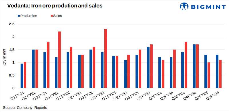 Iron ore production was recorded at 2.6 million tonnes (mnt) in H1FY’25, up 6% y-o-y compared to 2.4 mnt in H1FY’24. The majority of output, 2.4 mnt, was from the Karnataka mines.