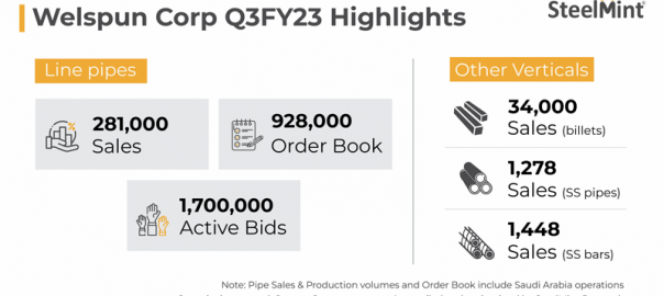 Company’s global order book position: Welspun’s current global order book position stands at 9,28,000 t valued at INR 13,200 crores. Active bid books are at 17,00,000 t in Q3FY2023.