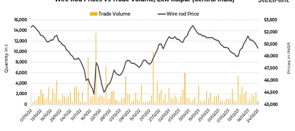 On a weekly basis, as per SteelMint assessment, the trade reference prices for wire rods in Raipur dropped by INR 1,200/t to INR 50,000/t as against INR 51,200/t exw and similarly, in the Durgapur market, the drop was by INR 1,300/t to INR 50,000 against INR 51,300/t exw seen in the previous week.